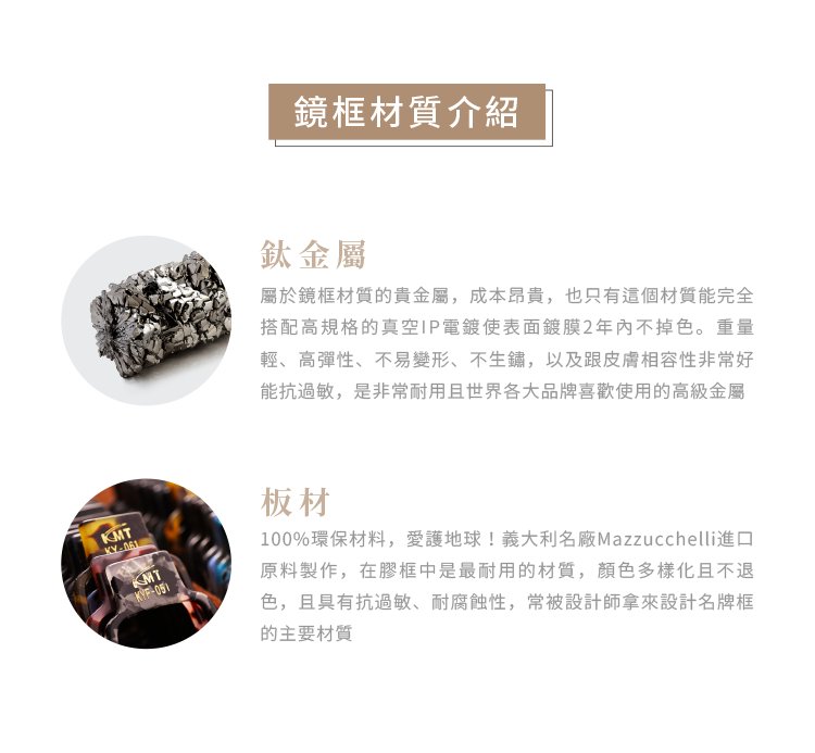 " 整個系列的框面皆採購自義大利Mazzucchelli工廠的[高密度]板材 "